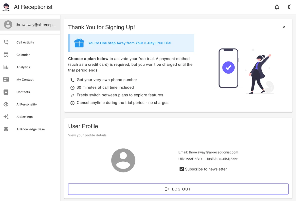 The Profile & Subscription page is your central hub for managing your AI Receptionist account. Here you'll find all essential account information including your display name, email address, and unique user ID. This page provides a comprehensive overview of your subscription status, showing which plan you're currently on (Essential, Solopreneur, or Business) and how many call minutes you've used this billing cycle. Track your usage to ensure you're staying within plan limits and upgrade if needed. The subscription management section allows you to update your payment method, view billing history, and download invoices directly through our secure Stripe integration. Make changes to your plan or cancel your subscription from this page. You can also update your profile picture and display name to personalize your account. This is the go-to location for understanding your account status at a glance and making necessary changes to subscription or billing information.